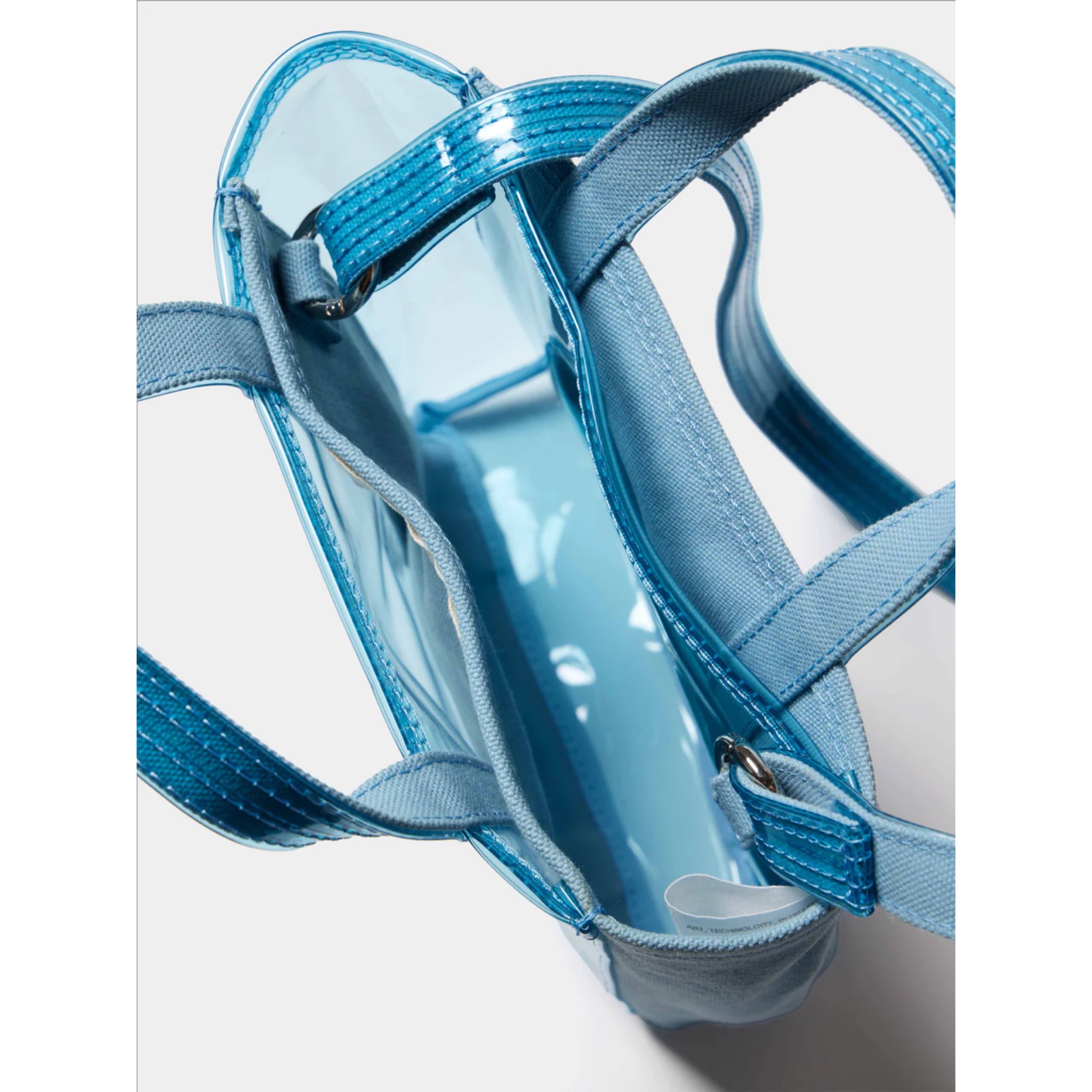 “自然物と人工物の共存”を思い描き、クリアPVCとコットンキャンバスを互い違いに縫い合わせた構造が特徴。